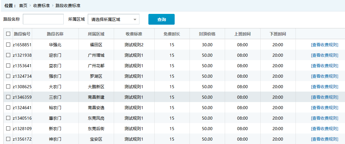 ●路段收費標準:根據系統添加的路段,對應的收費標準記錄,可點擊“查看收費規則”了解收費標準的明細,每個路段可以執行不同的收費規則。