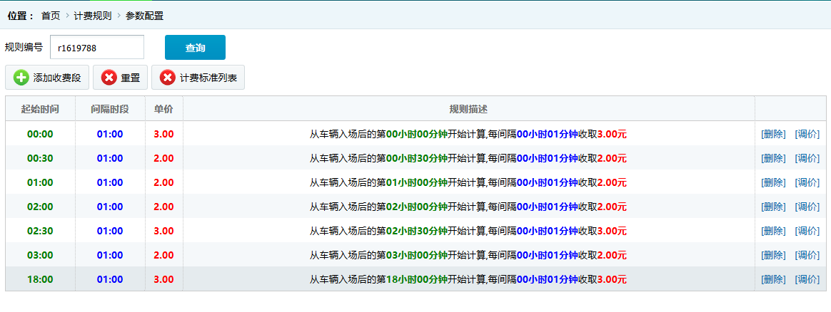 ●配置收費規則:設置收費標準中,按時段收費的規則明細,收費規則信息可更改,規則明細記錄可調整。