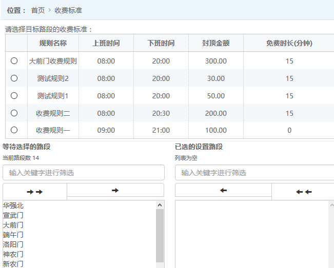 ●添加收費規則:在列表中可選中指定的收費標準,對應到多個路段中,如圖: