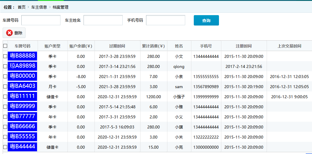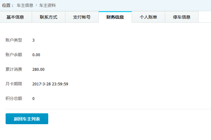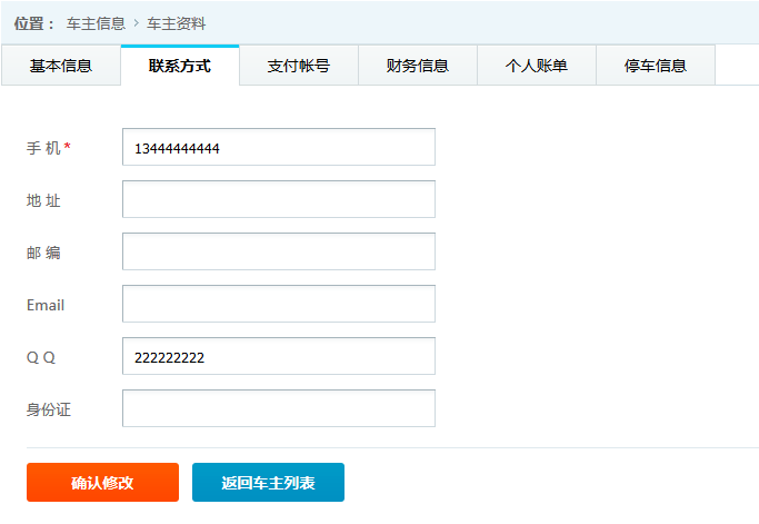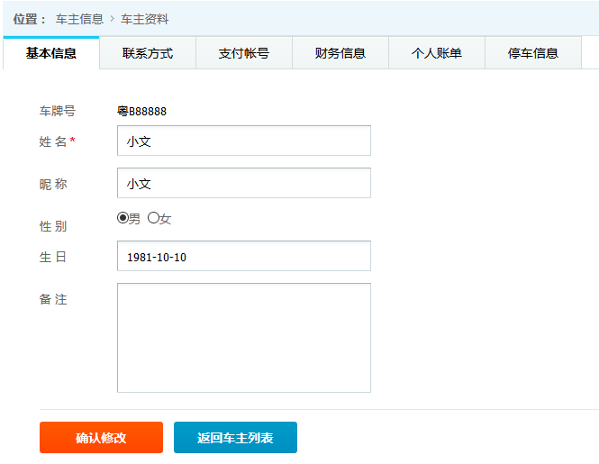 ●車主詳細信息 查看并維護車主的基本信息,旭歐科技系統中自動為進場停車的車輛建立會員賬戶,方便交費充值等服務。在此功能中,管理員可對車主詳細信息查看并修改,如下圖: