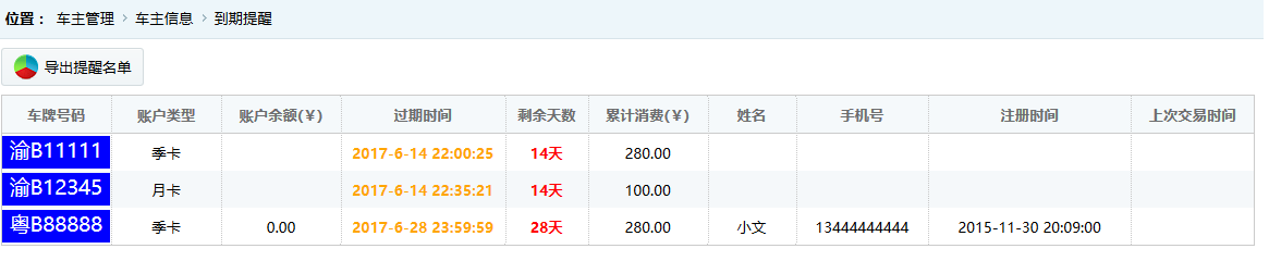 ●到期提醒 顯示月卡車主中離到期時間小于30天的賬戶信息,如圖:
