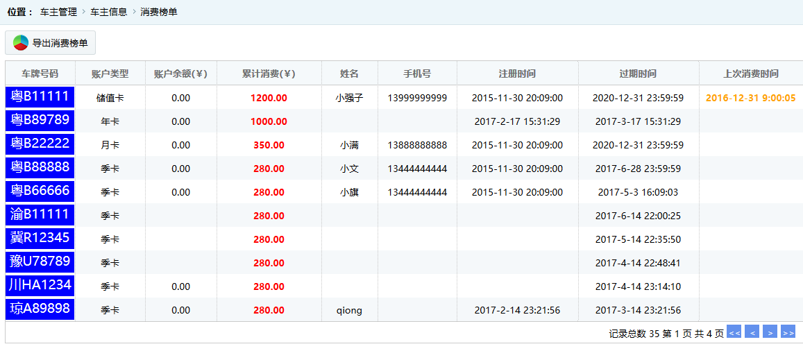 ●消費榜單 按照累積消費的總金額從大到小排序,默認顯示前幾位累積消費多的車主用戶。如圖: