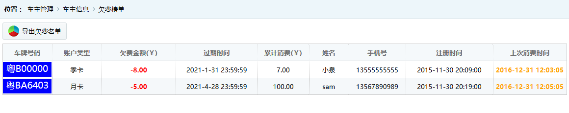 ●欠費榜單 按照累積欠費的總金額從大到小排序,默認顯示前幾位累積欠費多的車主用戶。如圖: