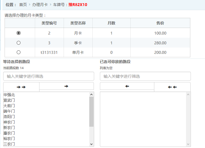 ●辦理月卡 輸入車牌號,辦理相應的月卡套餐,如圖: